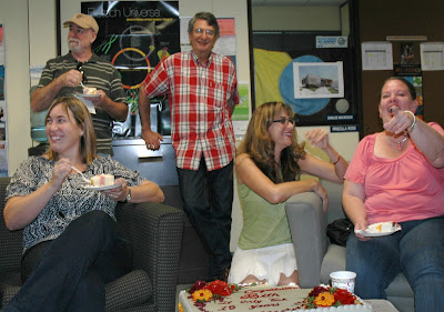 Starting at about 2:00, people came for the cake and to offer good wishes. Faculty, classified, administrators, and students dropped by. Beth beamed.
